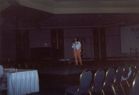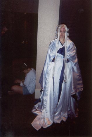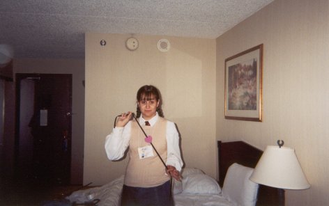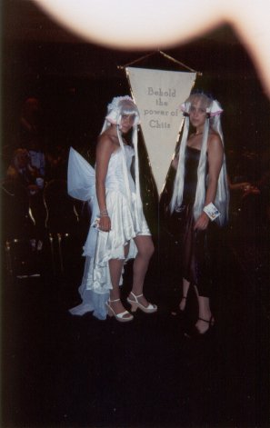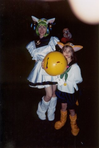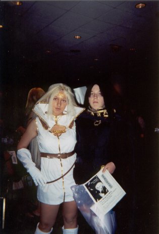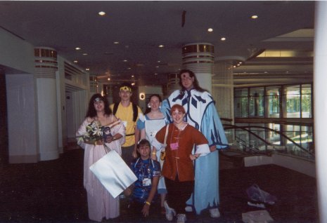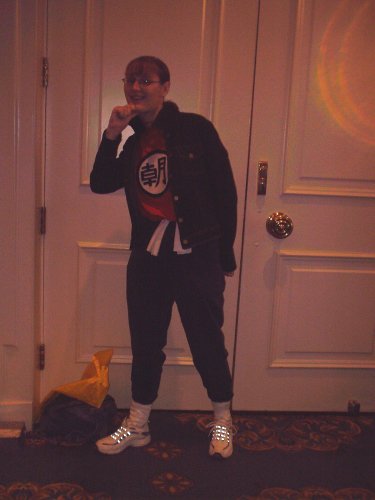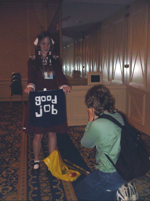 We're back at Shoujocon for 2003! This time around, a bunch of friends that were supposed to go last year, but ended up not being able to, we able to make it, so we had a huuuuge group. Yay for lots of people! Again, the con was three anime filled days of fun. Since I wasn't doing as many workshops this year, I was able to go to a lot more panels and games. Ooooh, also, I got a nifty new digital camera for the trip. It has auto-focus and a whole bunch of lighting adjustment features which I wsas experimenting with, but they work differently if you're using the LCD screen or the standard viewfinder to take the picture, so some of the pictures ended up a little hazy or dark (things like focus and lighting are hard to see in the tiny little preview picture). But not of the pictures have my finger obscuring part of the picture, so that's an improvement over last year, ne? ^^;;;