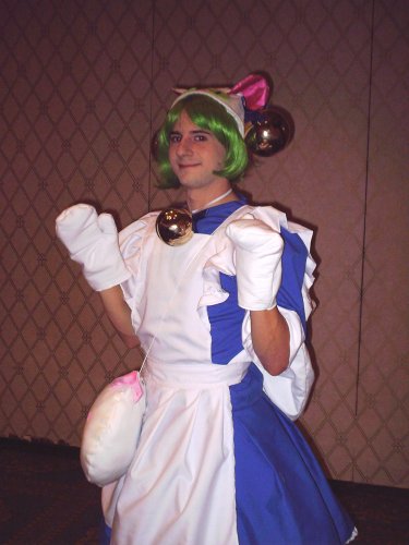 Claire poses as Bantaro from Jubei-chan. Her shirt actually changes kanji too (with the help of safety pins)!